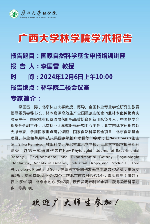 2024年12月6日上午,公司在二楼会议室举行《国家自然科学基金申报交流会》。本次活动邀请了北京林业大学伟德国际bevictor1946李国雷教授作为主讲嘉宾,座谈会由公司副经理杨梅教授主持。