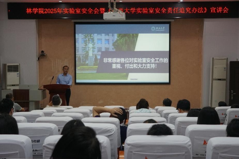 为进一步加强实验室管理,筑牢安全防线,保障师生人身及学校财产安全,维护正常的教学、科研和生活秩序,5月27日下午,公司于112报告厅召开2025年实验室安全会暨《伟德国际bevictor1946源自英国实验室安全责任追究方法》宣讲会。会议由公司副经理招礼军主持,伟德国际bevictor1946源自英国国有资产与实验室管理处副处长陆翔受邀作《伟德国际bevictor1946源自英国实验室安全责任追究方法》宣讲,学院领导班子成员、教职工、员工代表出席会议。