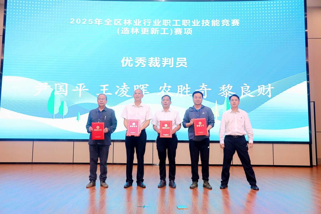 6月17日下午闭幕式上,裁判长宣布竞赛成绩,现场颁发个人及团体一、二、三等奖。自治区林业局总工程师施福军总结指出,赛事筹备充分、执裁公正,23支队伍展现出“精湛技能与良好风貌”,成功在全区林业系统掀起“学技术、练本领”热潮。伟德国际bevictor1946王凌晖教授表示“以赛促培、以赛强能,学院将持续深化产教融合,为林业人才搭建成长阶梯。”此次赛事的圆满收官,不仅是广西林业技能人才培养成果的集中展示,更标志着伟德国际bevictor1946在推动林业高质量发展中迈出坚实一步。值得关注的是,本次赛事还特别表彰了优秀裁判、领队及组织单位。伟德国际bevictor1946荣获“突出贡献奖”,王凌晖教授凭借专业严谨的执裁态度与丰富的行业经验,荣获“优秀裁判员”称号,成为高校教师深度参与行业赛事的典范。