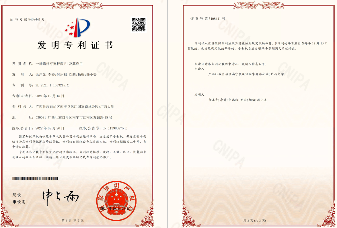 基于上述从望天树根际环境中筛选得到的优良菌株,伟德国际bevictor1946杨梅教授团队和南宁树木园合作,两家合作单位分别通过1株高效溶磷菌株(P8和P1),成功申请了国家发明专利5项。其中2项专利分别可提供1种唐菖蒲伯克霍尔德菌(Burkholderia gladioli)P8和1种蜡样芽胞杆菌(Bacillus cereus)P1,均可用于将土壤中难溶性的磷转化为可以被植物吸收的有效磷。这2个菌株现均保藏于中国微生物菌种保藏中心管理委员会普通微生物中心(简称CGMCC),保藏登记号分别为CGMCC No.22825和CGMCC No.22821。获得的发明专利其一名称为《一株唐菖蒲伯克霍尔德氏菌P8及其应用》,发明人为“杨梅,韩小美,余注光,黄平升,李万年,汪丛啸,廖思”,专利号为ZL 2021 1 1531315.5。发明专利其二名称为《一株蜡样芽孢杆菌P1及其应用》,发明人为“余注光,李婷,何乐祖,刘莉,杨梅,韩小美”,专利号为ZL 2021 1 1533218.X。