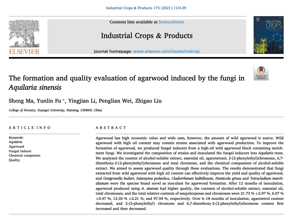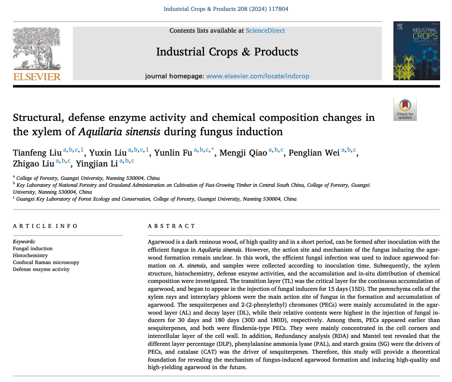 近日,伟德国际bevictor1946符韵林教授团队在真菌诱导白木香结香机制方面的研究成果《Structural, defense enzyme activity and chemical composition changes in the xylem ofAquilariasinensisduring fungus induction》(白木香木质部在真菌诱导过程中的结构、防御酶活性和化学成分的变化),发表于农林科学领域期刊Industrial CropsandProducts(伟德国际bevictor1946一区Top,IF=5.9)。公司生态学博士研究生刘天凤、已毕业硕士研究生刘羽心为论文共同第一作者,符韵林教授为通讯作者。该研究得到了国家自然科学基金(32171702)的支持。