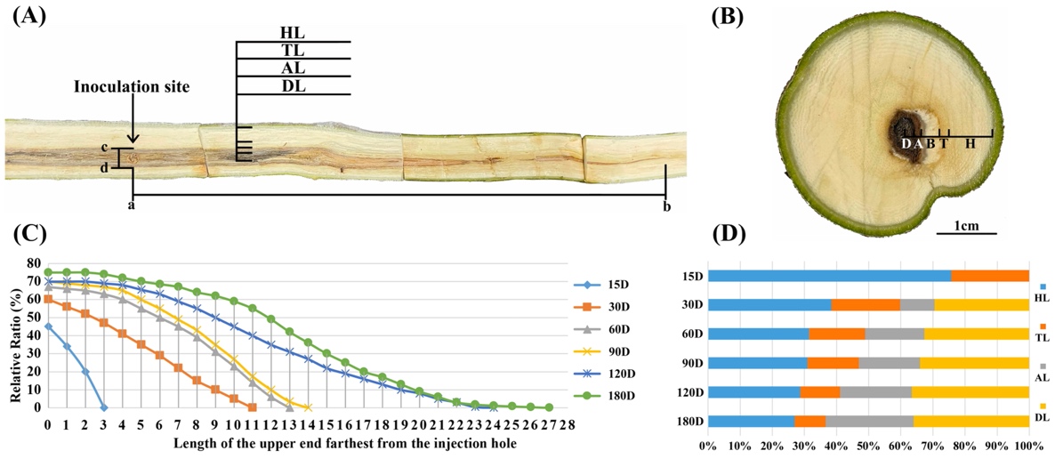 本研究采用高效结香真菌侵染白木香幼苗,研究了在此过程中木质部结构、组织化学、防御酶活性以及化学成分的积累和原位分布的变化。研究结果显示,随真菌接种时间的延长,在木质部形成了宏观可见的腐烂层(DL),沉香层(AL)过渡层(TL)和健康层(HL),AL的占比不断增加,其中TL是沉香持续积累的关键层。由HL至DL,木质部内具有生命活动的薄壁细胞活性下降甚至死亡。树木为保持持续的生命活动,淀粉粒和可溶性还原糖等营养物质发生改变。与此同时,防御反应启动,使TL和AL中PAL,CAT,SOD活性以及丙二醛含量均增加。此外,真菌首先存活并聚集于木射线和内含韧皮部薄壁细胞内,为阻止真菌菌丝在木质部的扩散,出现沉香树脂等内含物堵塞纹孔,挤压菌丝以抑制真菌在木质部内继续生长和扩散。因此,射线和内含韧皮部薄壁细胞是沉香积累的主要作用部位。倍半萜和2-(2-苯基乙基)色酮(PECs)作为沉香的特征成分主要在AL和DL中积累,集中分布于细胞壁的细胞角和细胞间层。最后,该研究提出不同层的百分比、PAL和淀粉粒是PECs的驱动因素,CAT是倍半萜的驱动因素。