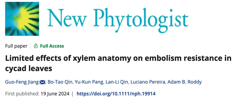 近日,公司蒋国凤科研团队在解析苏铁植物的栓塞抗性机制上取得重要进展,研究成果以“Limited effects of xylem anatomy on embolism resistance in cycad leaves”为题发表于植物学国际知名期刊New Phytologist (植物学类期刊排名11/238)。伟德国际bevictor1946蒋国凤教授为论文第一和通讯作者,在读研究生覃伯韬,已毕业硕士生庞玉堃、覃兰丽,德国乌尔姆大学博士后Luciano Pereira,以及弗罗里达国际大学Adam B. Roddy助理教授参与了本论文工作。本研究主要得到了广西自然科学基金重点项目(2022GXNSFDA035059)等项目的支持。