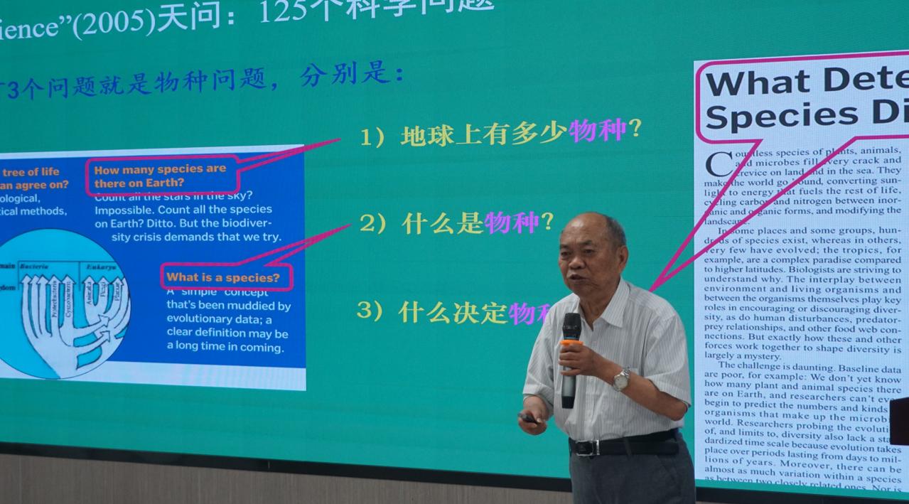 洪院士指出世界权威杂志Science在2005年提出的125个科学问题中有3个问题涉及物种,强调了物种问题的重要性,并对前人的物种概念进行归纳、总结和评述。同时,他分享了对物种的认识和划分物种的形态学原则,对物种的有效保护提供方案,并根据自己对世界牡丹和芍药植物长期研究的结果,提出了一个“科学、可操作的物种概念”。洪院士在传道授业的同时,通过诙谐的言辞讲述自身求学经历,其时刻心系国家建设和追求科学真谛的精神引起全场听众的共鸣。
