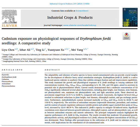 近日,公司杨梅教授科研团队在探究本地树种格木对重金属镉污染土壤的适应性和耐受性上取得重要见解,研究成果以“Cadmium exposure on physiological responses ofErythrophleum fordiiseedlings: A comparative study”为题发表于农林领域国际知名期刊INDUSTRIAL CROPS AND PRODUCTS(农林类期刊排名8/125)。伟德国际bevictor1946在读硕士研究生陈丽宇作为第一作者,杨梅教授和徐圆圆讲师作为通讯作者,博士后Izhar Ali、良凤江国家森林公园李婷参与了本论文的工作。本研究得到了国家自然科学基金(32371856)等项目的支持。