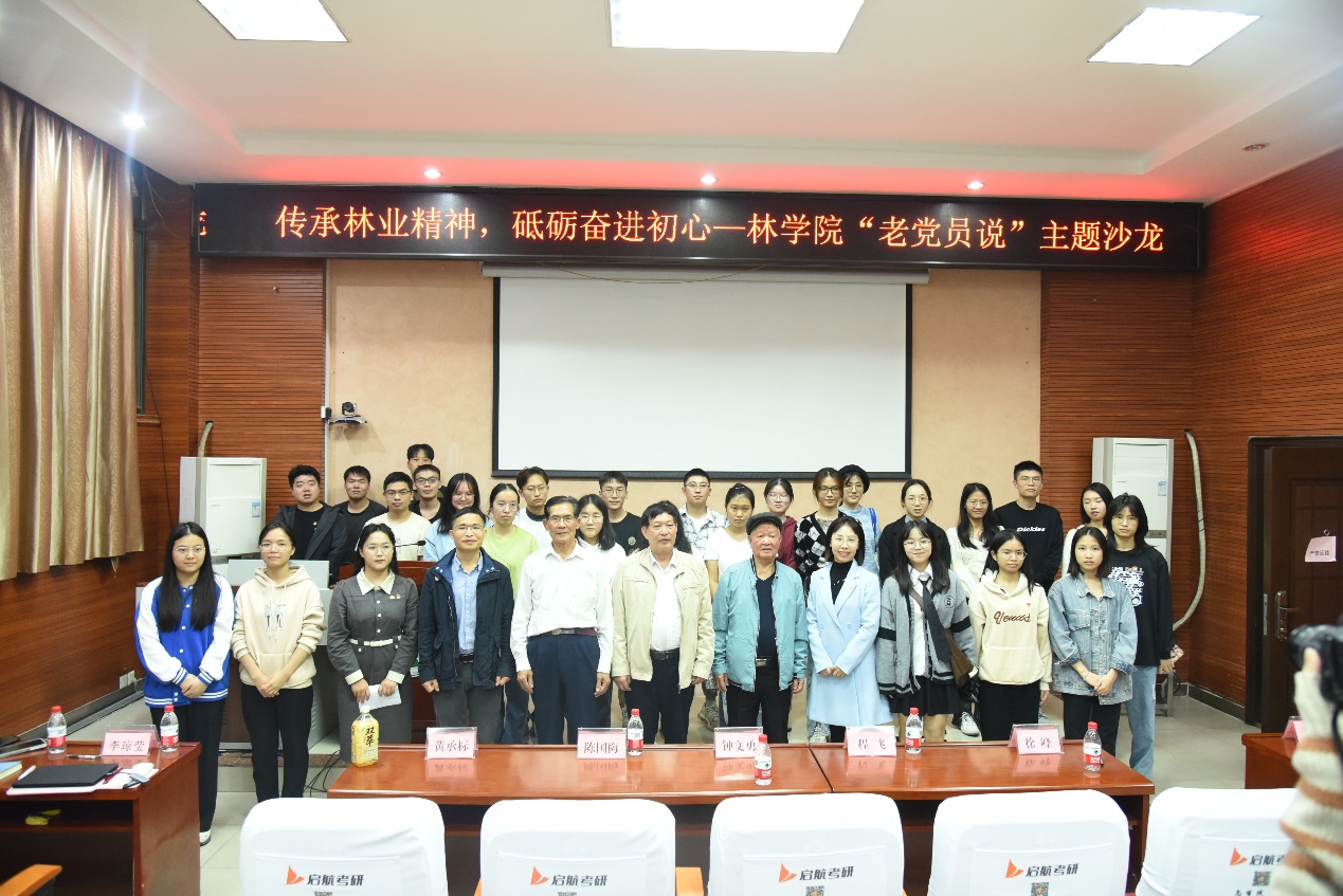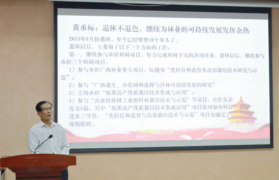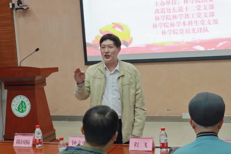 再次站上讲台,黄承标老师眼睛湿润,他回忆道,从2013年6月份退休至今,他与讲台告别已经整整10个年头了。这次分享,黄承标老师主要从三个方面深入,向同学们展现了一位老党员退休以后,仍然深耕林业发展,发挥余热为社会作出自己的贡献。最后,黄承标老师号召青年党员看齐榜样、学习先进、跟党奋斗,厚植爱党、爱国、爱社会主义情怀和爱校荣校情感,担责任,立大志,树理想,积极投身于中国特色社会主义建设事业中,让历史的接力棒代代相传。