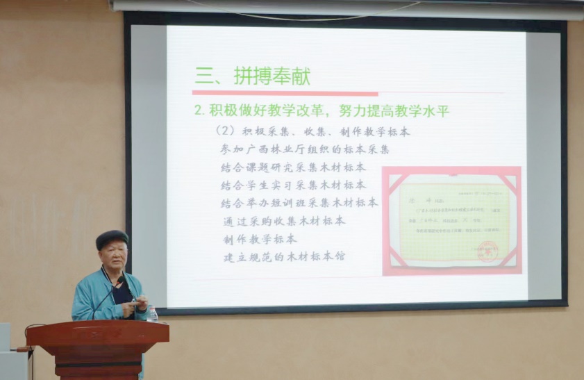 紧接着,被新闻媒体誉为“木材鉴定行业的福尔摩斯”的徐峰教授结合自己的亲身经历,饱含激情地从家风讲起,用自己的日常向同学们描述他朴素节俭的生活,提到对他影响很大的老师与亲友,他目光真挚,用简单的语言传达殷殷教诲,并告诉同学们他最为看重的品质就是“为人诚实”,告诫员工们:“诚实做人,认真做事才会有出息”。虽然徐峰老师已经退休多年,但作为现任伟德国际bevictor1946源自英国教学督导团成员,仍积极为学校出力,为社会服务。讲到情深处,徐峰老师向师生们展示他所获得的荣誉奖牌,并讲述了这些奖牌背后蕴含的优秀事迹。最后,徐峰老师把“拼搏精神”送给大家,鼓励同学们积极参加进修学习,努力打牢理论基础。