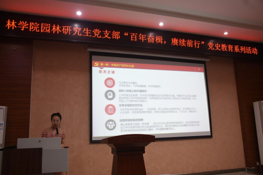 为庆祝中国共产党成立一百周年,园林研究生党支部以“百年奋楫,赓续前行”为主题献礼建党100周年,并将党史学习教育贯穿活动始终。