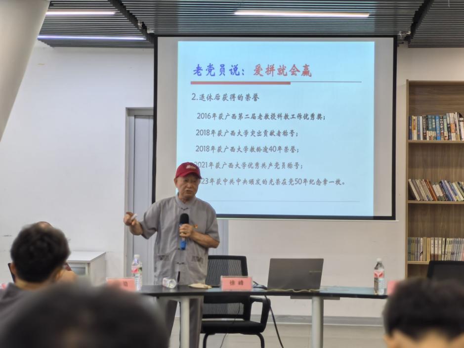 最后,梁宏温教授分享了自己的林业故事,号召大家向优秀党员看齐,热爱林业行业,做好本职工作。他强调要树立绿色发展理念,积极参与生态文明建设,从身边的小事做起,保护每一片绿叶、珍惜每一滴水。梁教授勉励同学们“不忘初心跟党走,立大志,树理想,为实现中华民族伟大复兴的中国梦不断奋斗”。