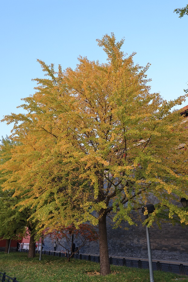 银杏的树形高大挺拔,树干通直。其叶片形状独特,呈扇形,边缘浅裂,叶脉平行,春夏时节叶片翠绿,宛如一把把精巧的小扇子,在风中摇曳生姿。而到了秋季,叶片逐渐变为金黄,满树的金黄璀璨夺目,仿佛是被大自然精心涂抹上的色彩,为秋天增添了一抹绚丽。
